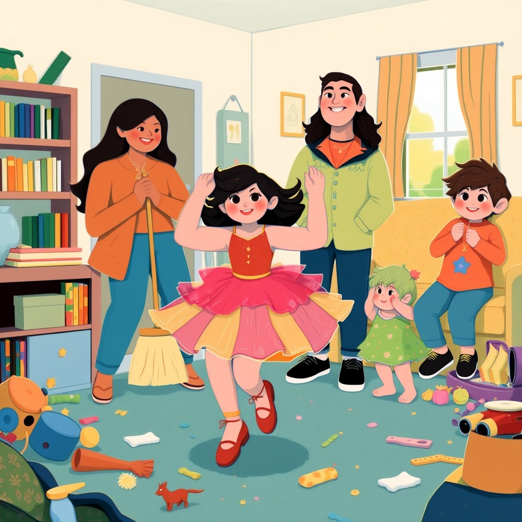 Once upon a time, in a happy little home, lived twins [Athena](YQXNM6QQ) and [Scarlett](5W676JTB), who were just over 4 years old. [Athena](YQXNM6QQ) loved to dance, swirling and twirling to her favorite songs like 'Un Poco Loco' and 'Huntrix.' Their [Mamae](VFM54M69) and [Luiz](VVMNHVYK) Curly Hair often clapped along, filling their home with music and laughter.
