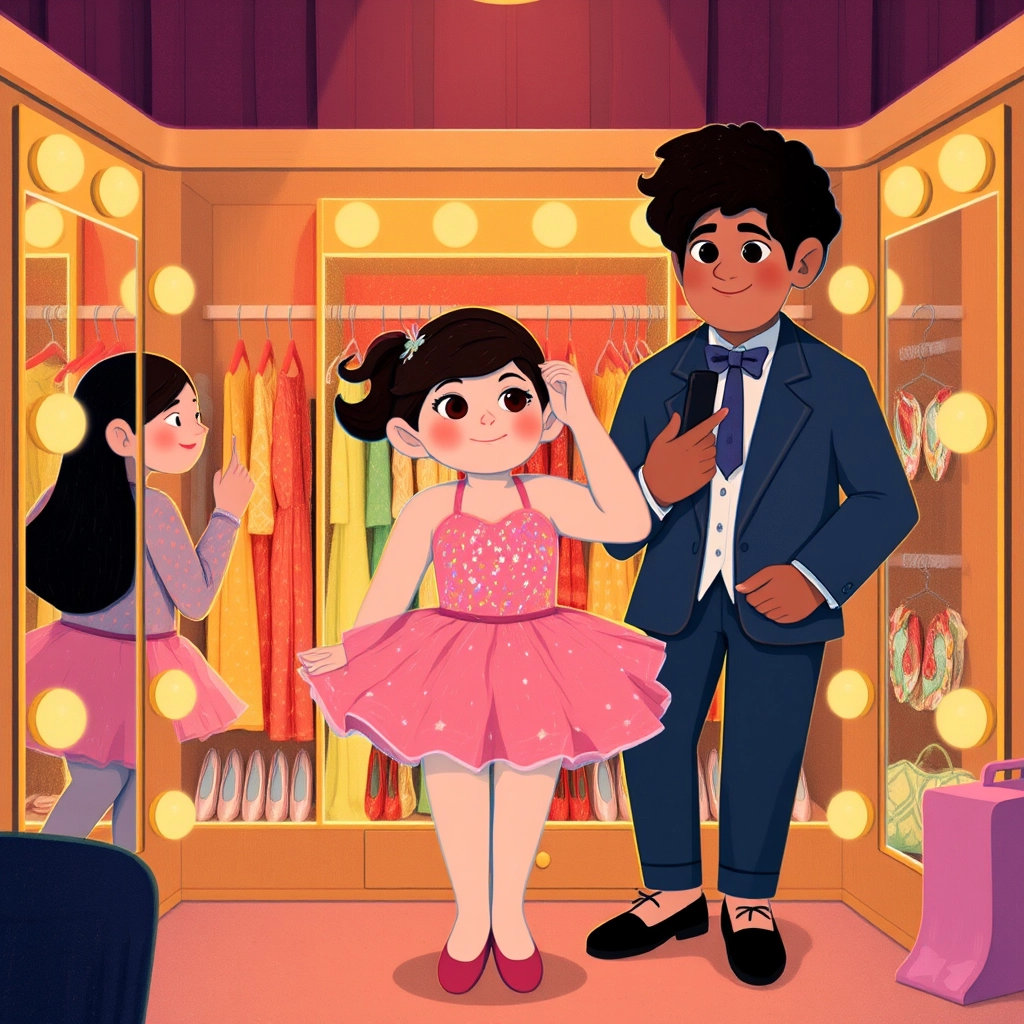 After weeks of hard work and twirls, [Athena](YQXNM6QQ) was ready! Her first big show took place in a grand theater. [Mamae](VFM54M69) made sure her costume sparkled perfectly, while [Luiz](VVMNHVYK) whispered words of encouragement.