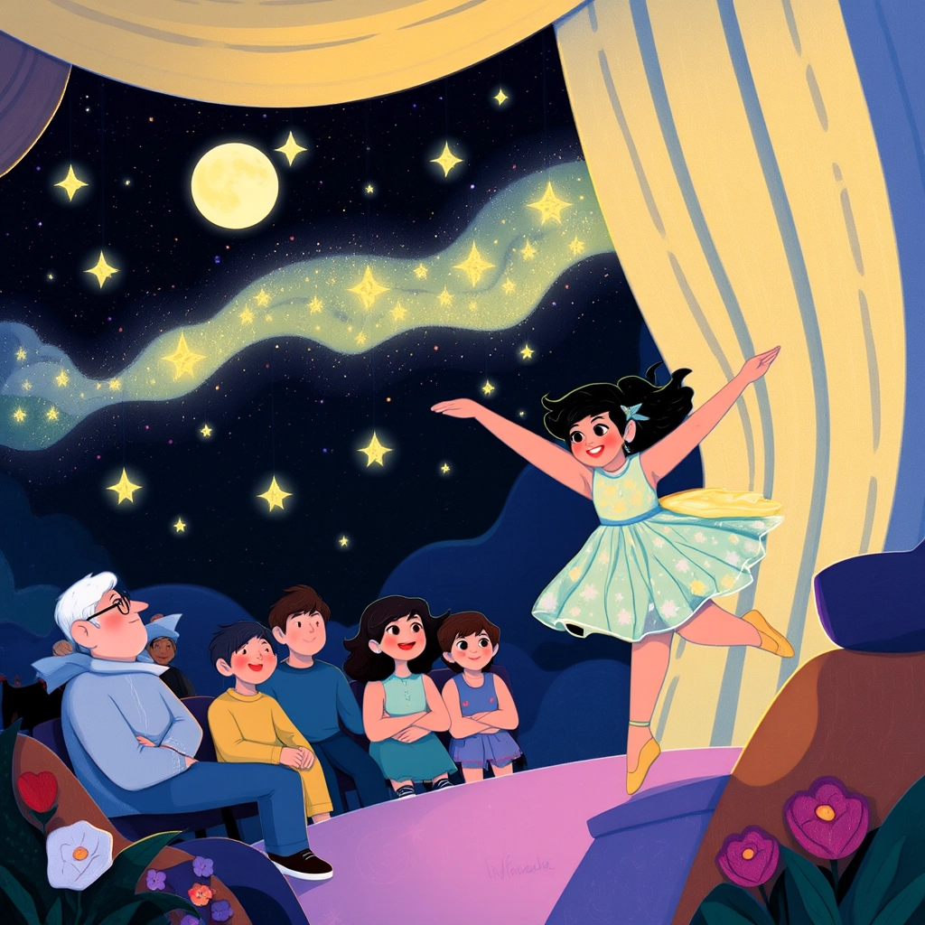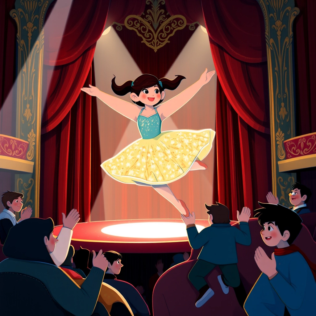 The curtains lifted, and [Athena](YQXNM6QQ) danced beautifully like a bright star. The audience clapped and cheered, and her heart swelled with pure joy. This was her moment to shine.