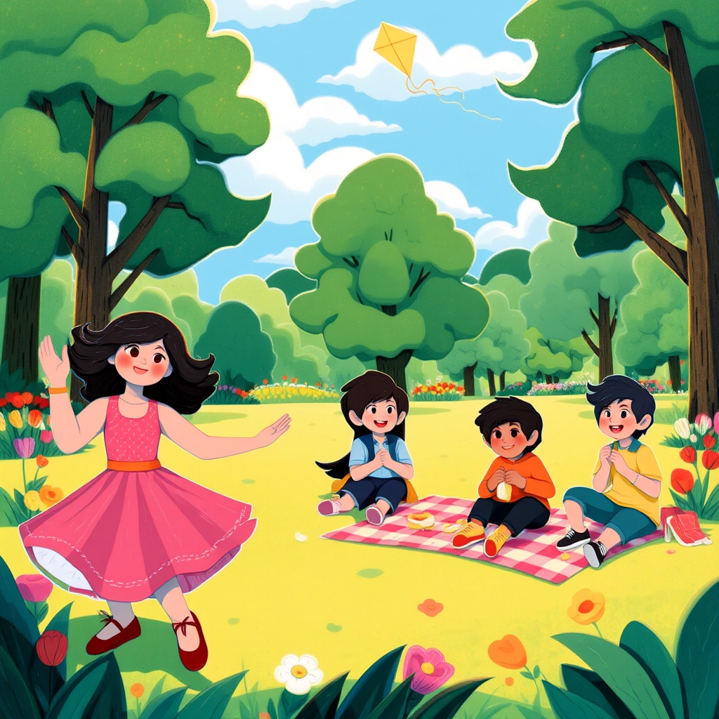One sunny afternoon, [Athena](YQXNM6QQ) took her dancing outside. She spun and leaped in the park near her home, her cheeks glowing red. [Scarlett](5W676JTB) and [Leo](HWK9Y6Q4) clapped from a picnic blanket, and [Luiz](VVMNHVYK) Curly Hair pretended to pull rabbits from invisible hats to entertain them.