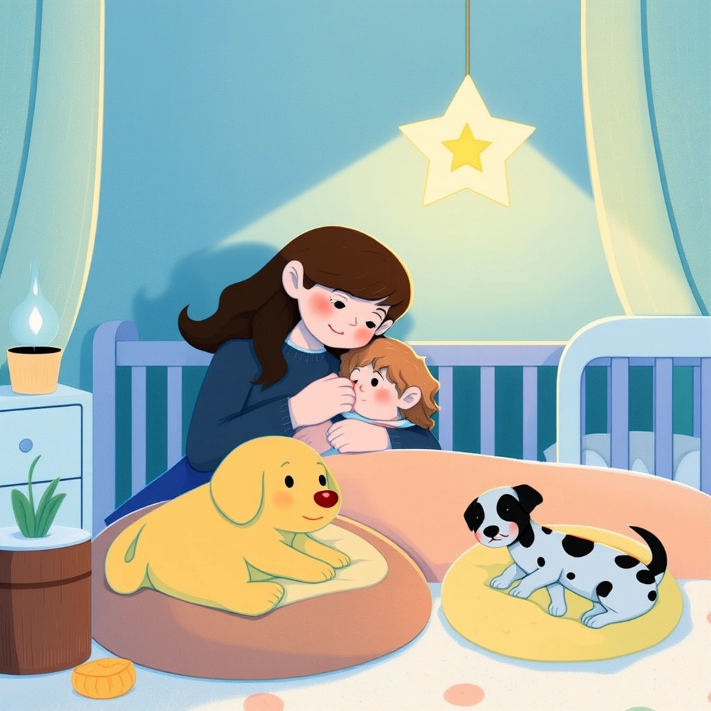Aubrey started preparing the nursery. She placed soft blankets, tiny socks, and a teddy bear inside the crib. Even [Bella](PT453957) and [Blue](GNTNRYCC) helped by wagging their tails and sniffing curiously.