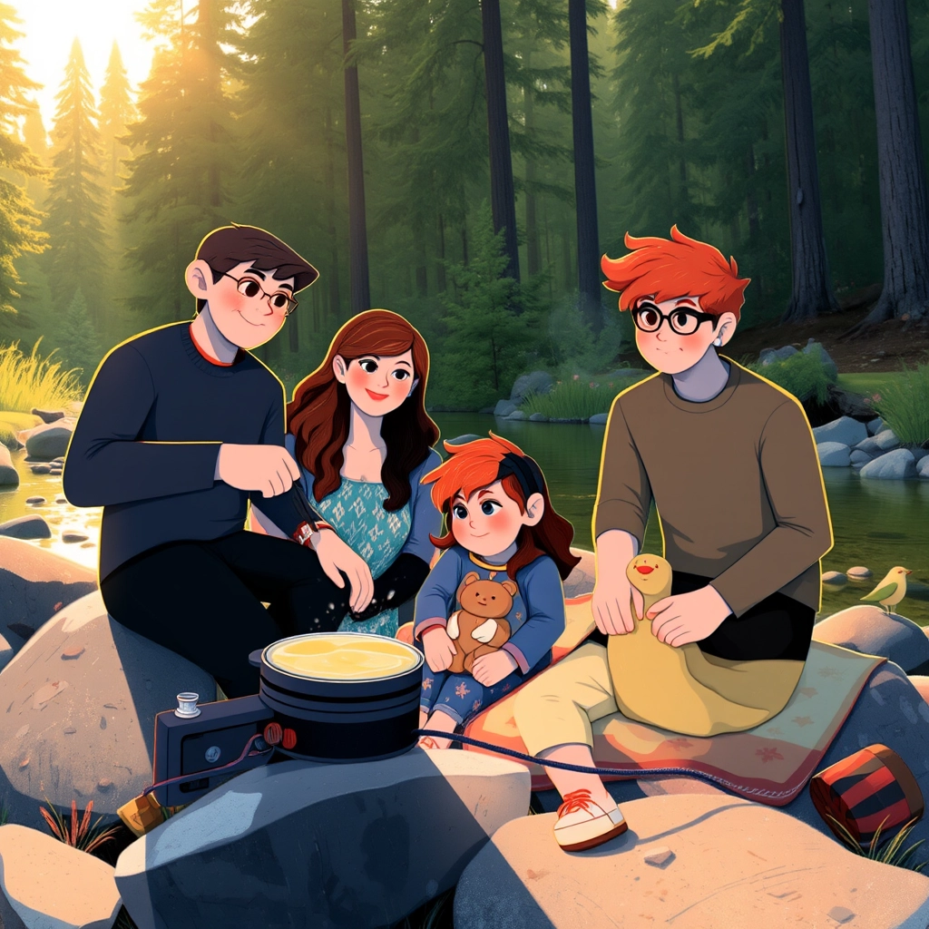 The next morning, [Autumn](SJSM2H6V) woke up to the sound of a bubbling creek. [Daniel](5C2VBPNM) smiled, ‘Who’s ready for breakfast by the water?’ They made pancakes on a tiny camp stove.