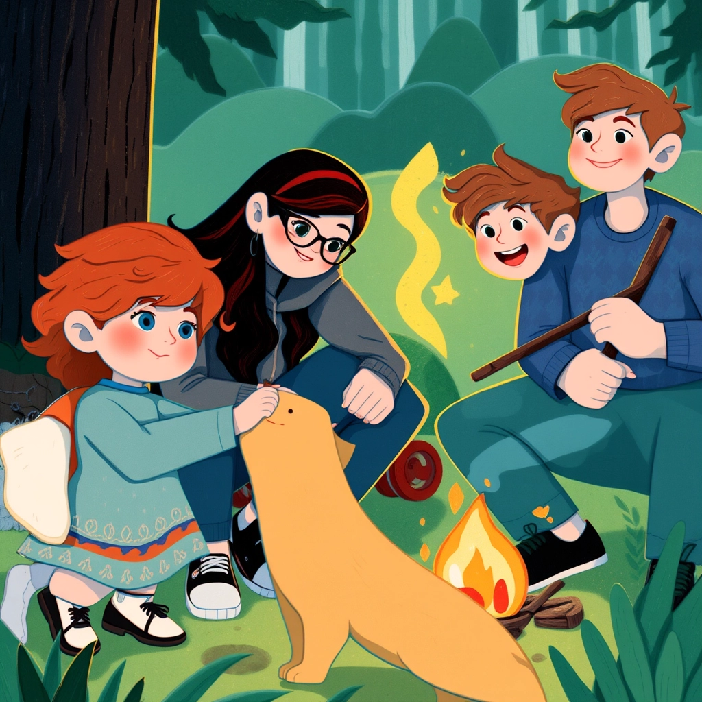 ‘Woof!’ A friendly dog from another campsite appeared, wagging its tail. [Autumn](SJSM2H6V) squealed happily. The dog stayed for some belly rubs and left with a happy bark.