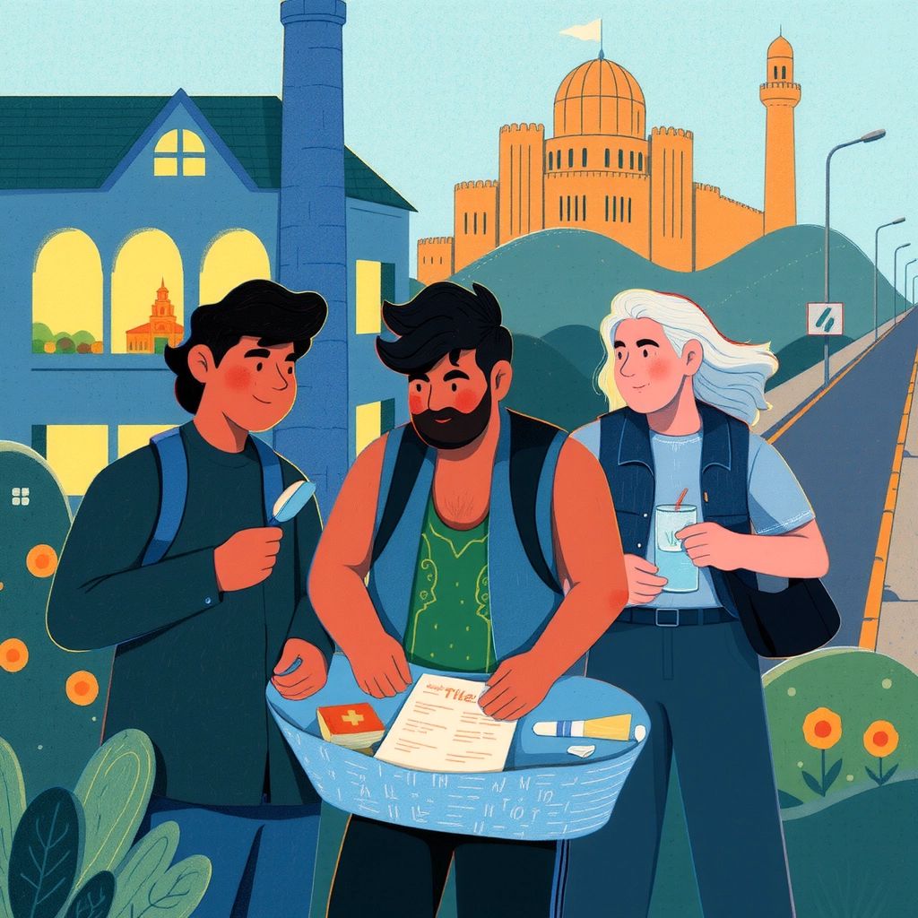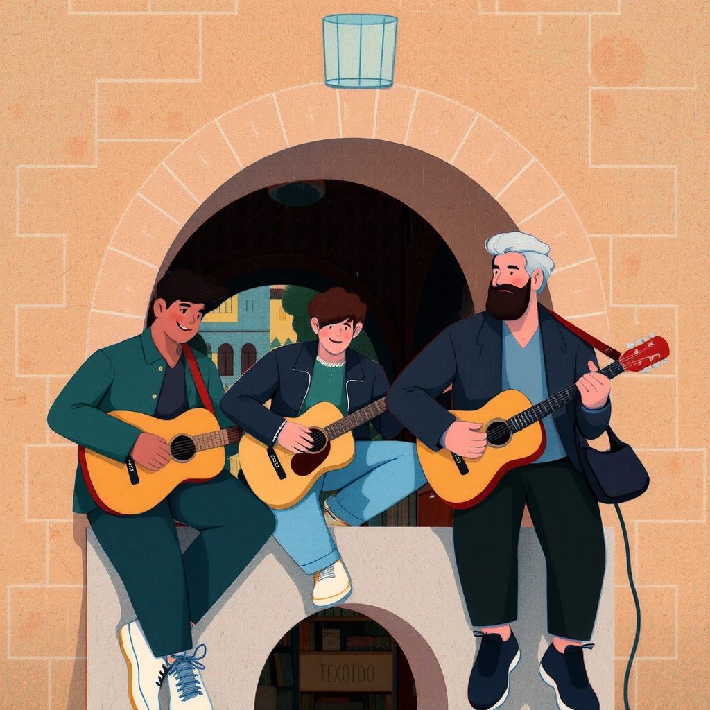 Mientras exploraban la ciudad, se toparon con un grupo de gitanos tocando música bajo un arco de piedra. La música llenaba el aire de alegría.