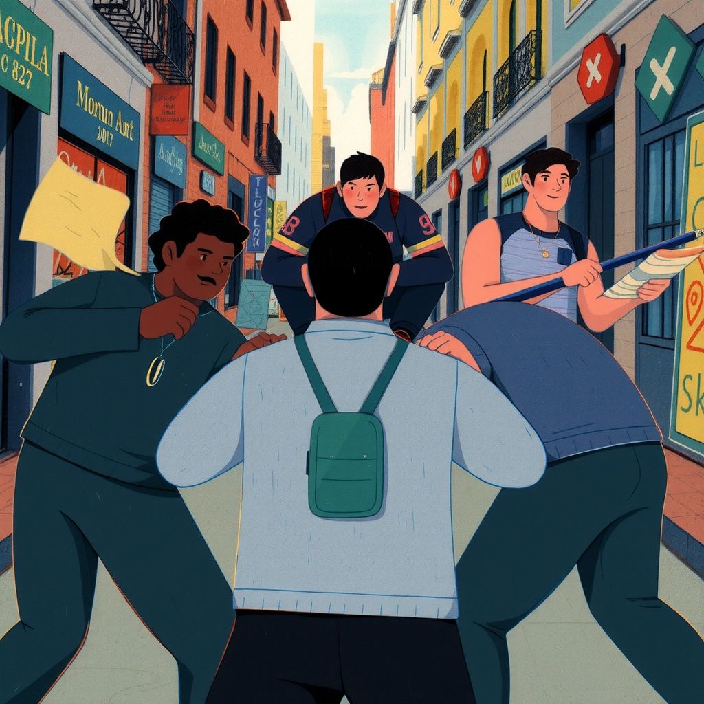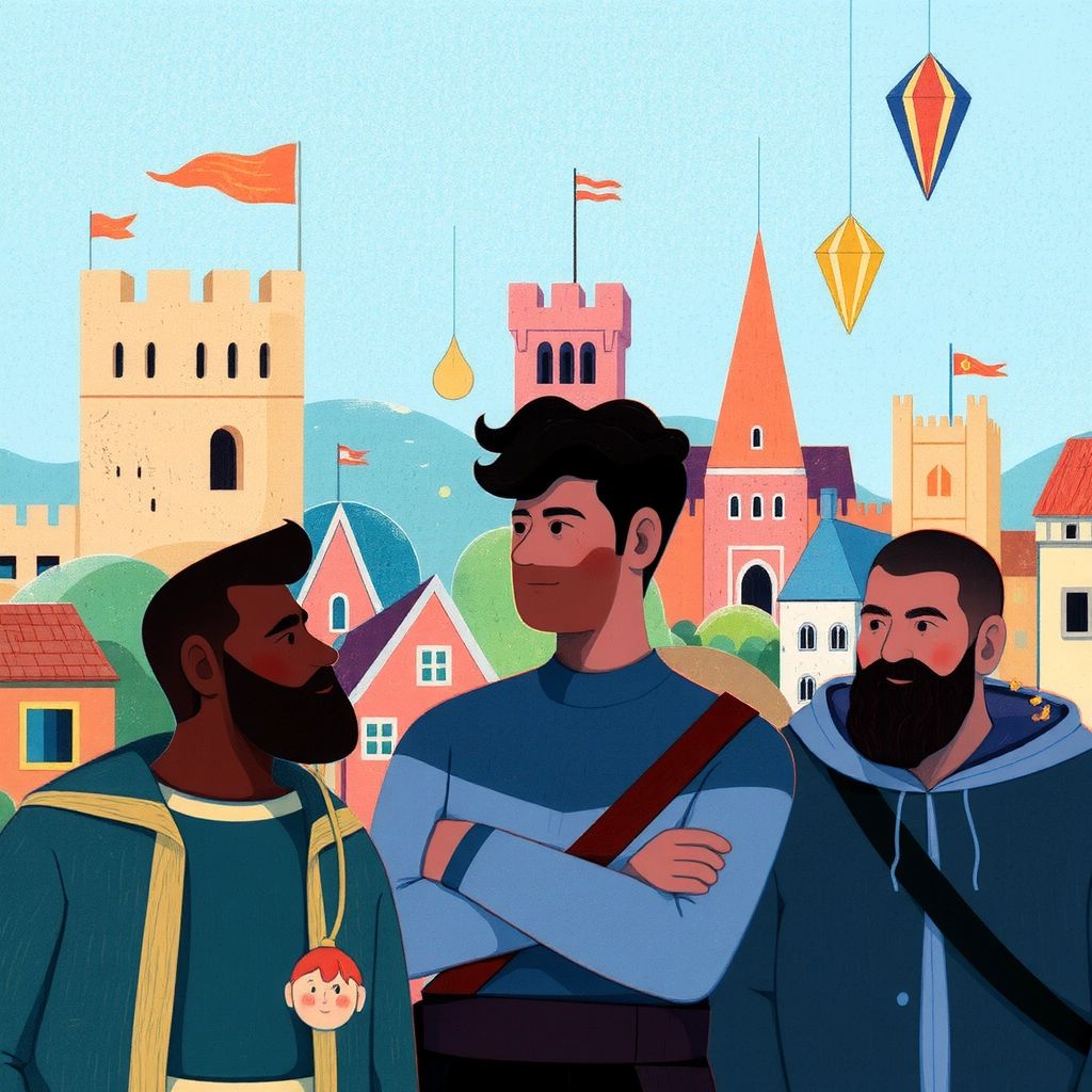 De repente, unos hombres peligrosos se acercaron, amenazando con interrumpir su aventura. Los amigos se agruparon rápidamente, confiándose mutuamente su valentía.