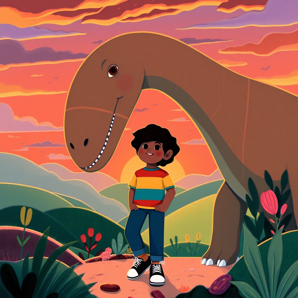 Val took [B.J.](9DST7GHT) to meet a towering Brachiosaurus. "Wow," said [B.J.](9DST7GHT), craning his neck to see its smiling face. "You’re like a walking skyscraper!" The Brachiosaurus chuckled softly.