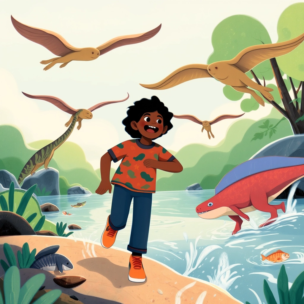 At a bubbling river, [B.J.](9DST7GHT) saw mischievous Pterodactyls swooping down to play. They challenged him to a race along the riverbank. "You’re fast, but I’m faster!" [B.J.](9DST7GHT) laughed as he ran his hardest.