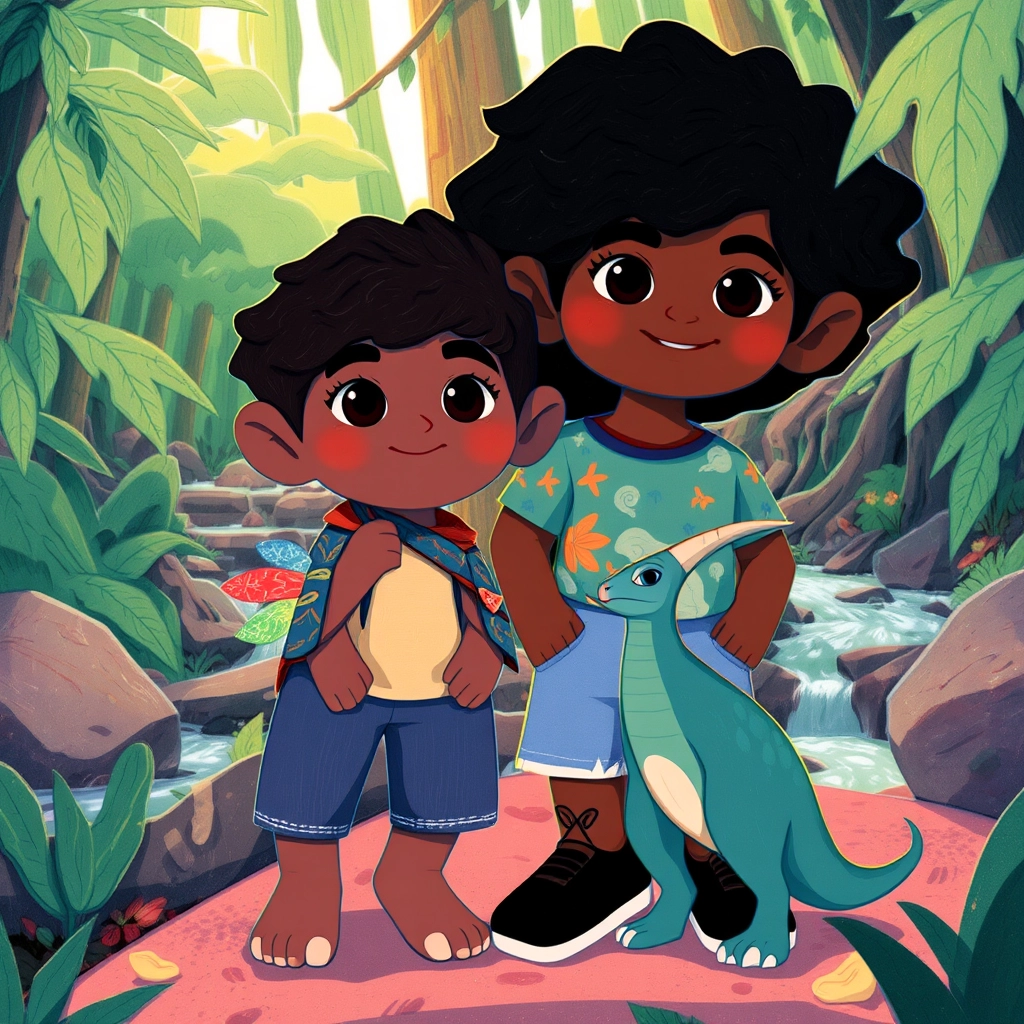 As [B.J.](9DST7GHT) explored, he met a tiny, feathered Velociraptor. "Hi, I’m [Val the Velociraptor](6NM2XNXJ)!" it chirped. "Let me show you around!" [B.J.](9DST7GHT) grinned and followed his new friend.