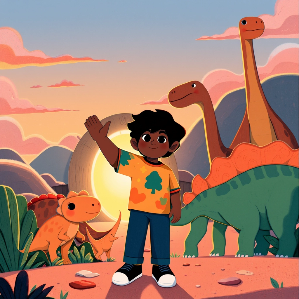As the sky darkened, [B.J.](9DST7GHT) knew he had to return. "I’ll never forget this adventure," he said. Val and the dinosaurs waved goodbye as [B.J.](9DST7GHT) stepped back through the golden portal.