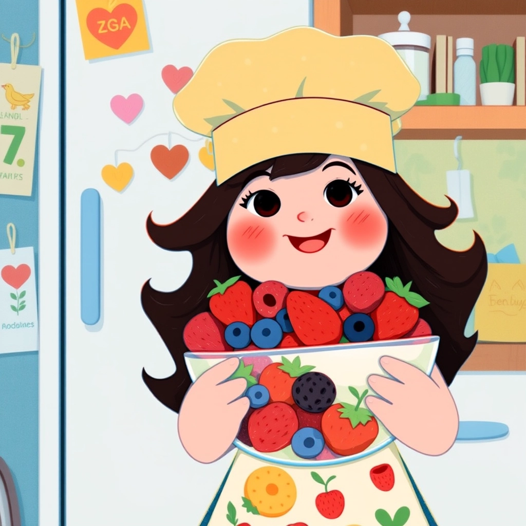 [Baby Zara](JKKDK5VC) finds a bowl of fresh berries. 'These will make our food healthy and tasty!' she exclaims.