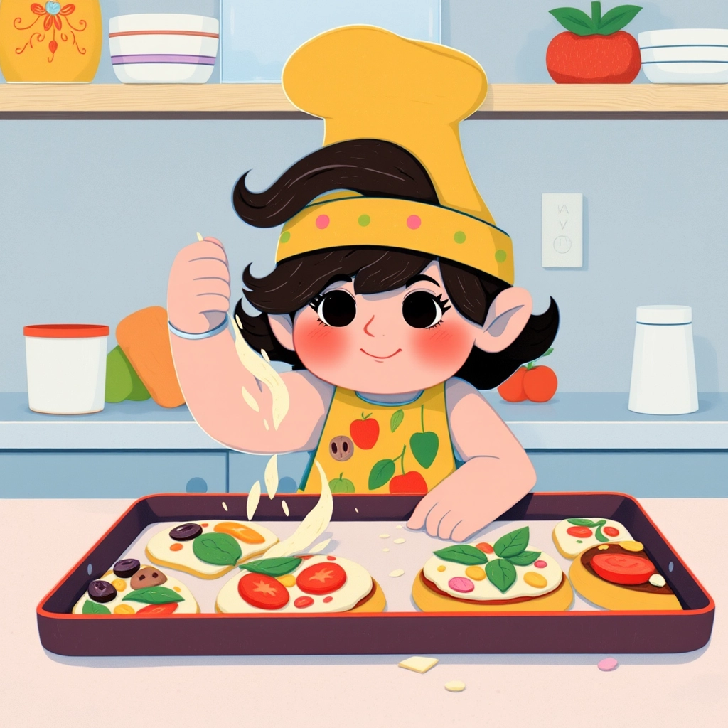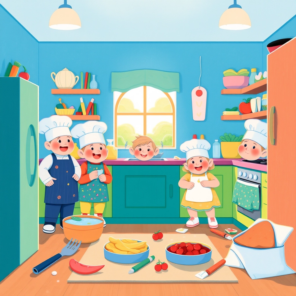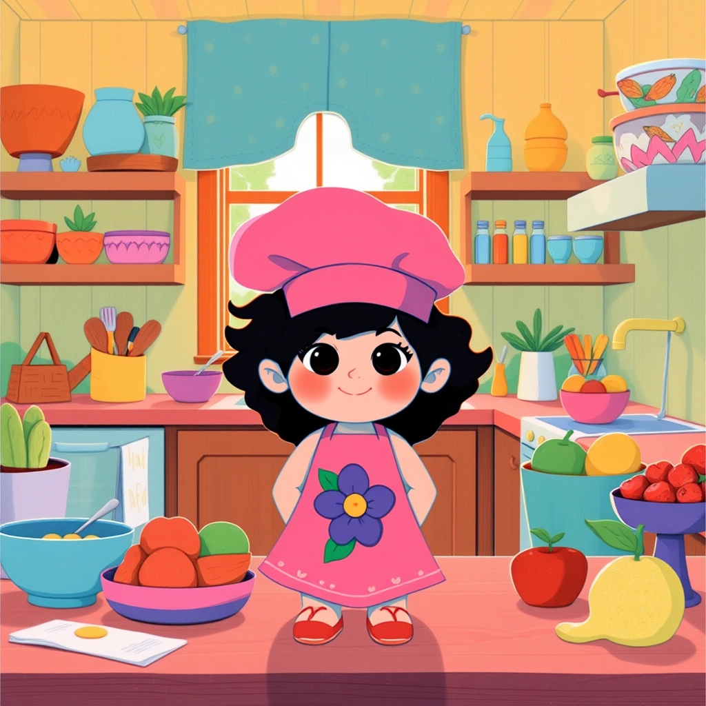 In a colorful kitchen, [Baby Mia](6BVDQFN2) invites her friends over to cook a delicious meal. She says, 'Let's make something yummy together!'