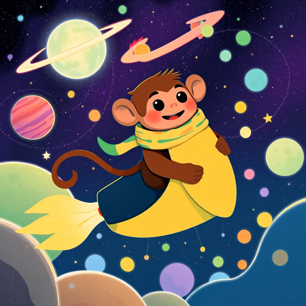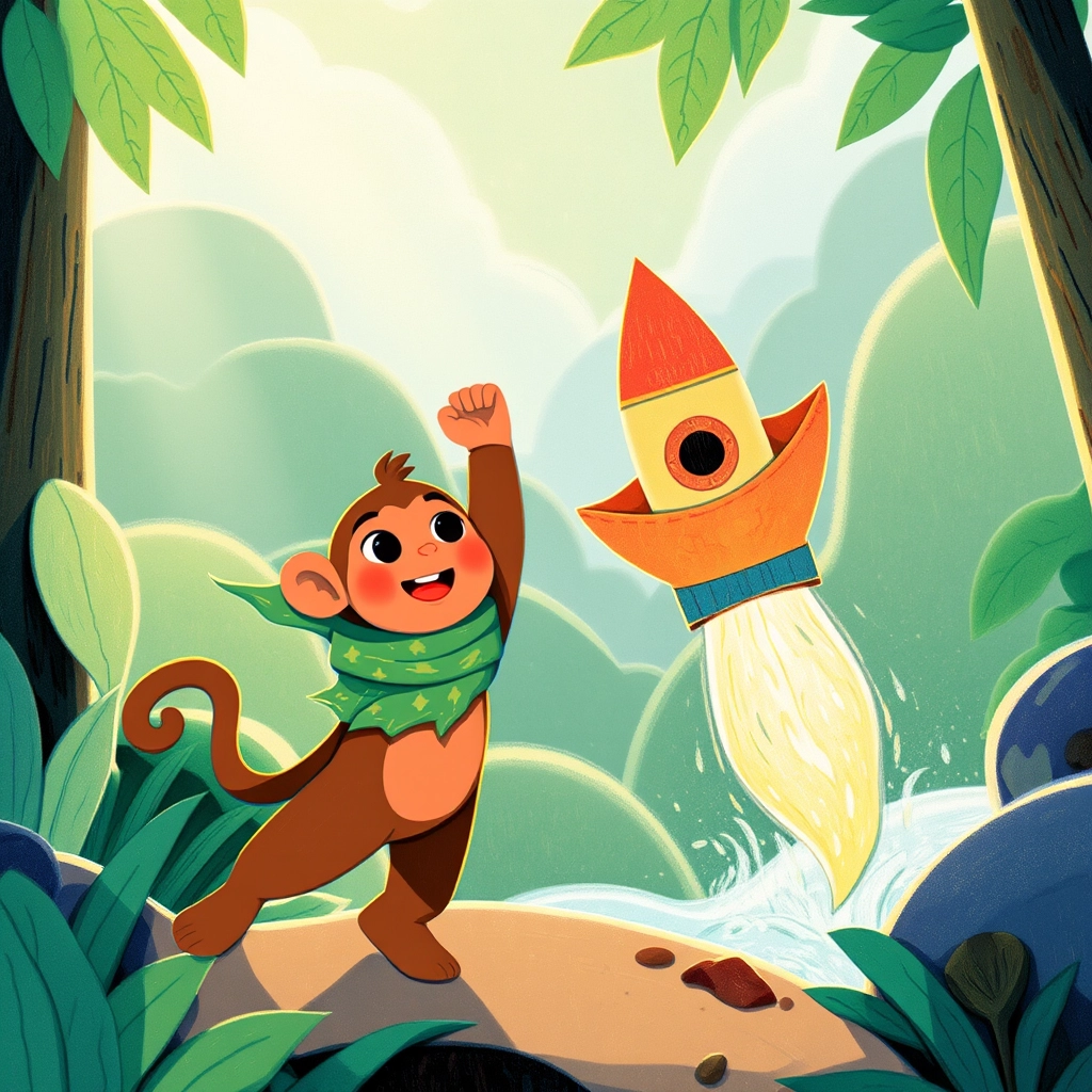 [Milo](N6V5CCXC)’s rocket soared back to Earth. The jungle animals cheered as their little monkey astronaut returned, bringing stories of moon adventures.