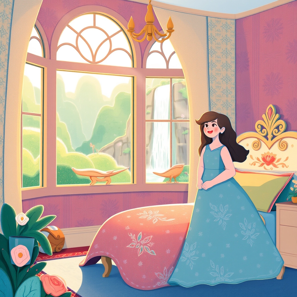 On her birthday morning, Bella woke up to the soothing sound of a waterfall near her castle. She leaped out of bed, ready for a day filled with wonder and magic.