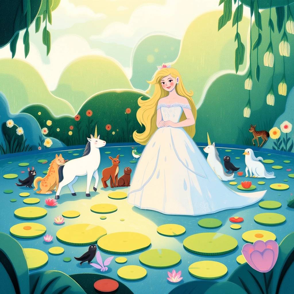 Bella hurried to the pond where her friends were waiting. They all cheered, 'Happy Birthday, Bella!' Standing beside them was a unicorn with a shimmering white coat and a golden mane.