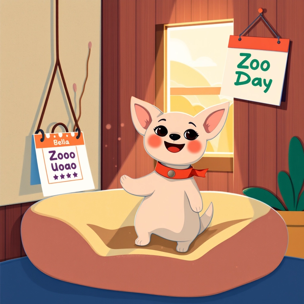 It was a sunny morning, and [Bella](5YJHWVJL) the Chihuahua woke up with excitement. Today was zoo day — her favorite day of the year!