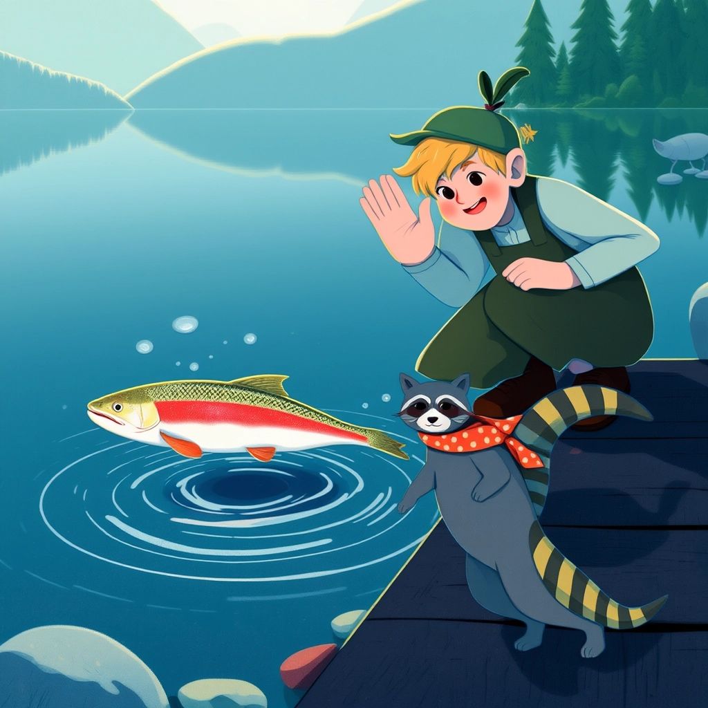 Carefully, they released the fish back into the lake. 'Thank you for the adventure!' [Ben](3SJ2N4Z3) said to the trout. It swam away, leaving ripples on the water.