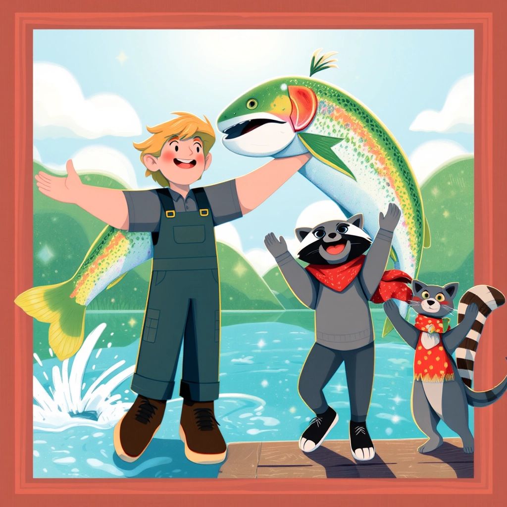 Out of the sparkling lake emerged a gigantic rainbow trout, glistening with colors! [Ben](3SJ2N4Z3) and [Emory](QD49KVZ2) laughed in surprise. 'It’s HUGE!' [Emory](QD49KVZ2) exclaimed. 'You did it, [Ben](3SJ2N4Z3)!'