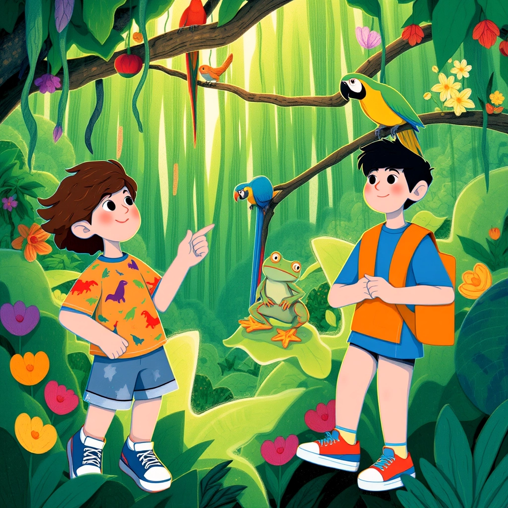 In the Jungle Zone, they spotted bright, squawking parrots. [Emory](BQTW9327) was amazed by a stunning blue and gold macaw, while [Ben](TW5Z2WK4) pointed out a tiny green tree frog camouflaged on a leaf.