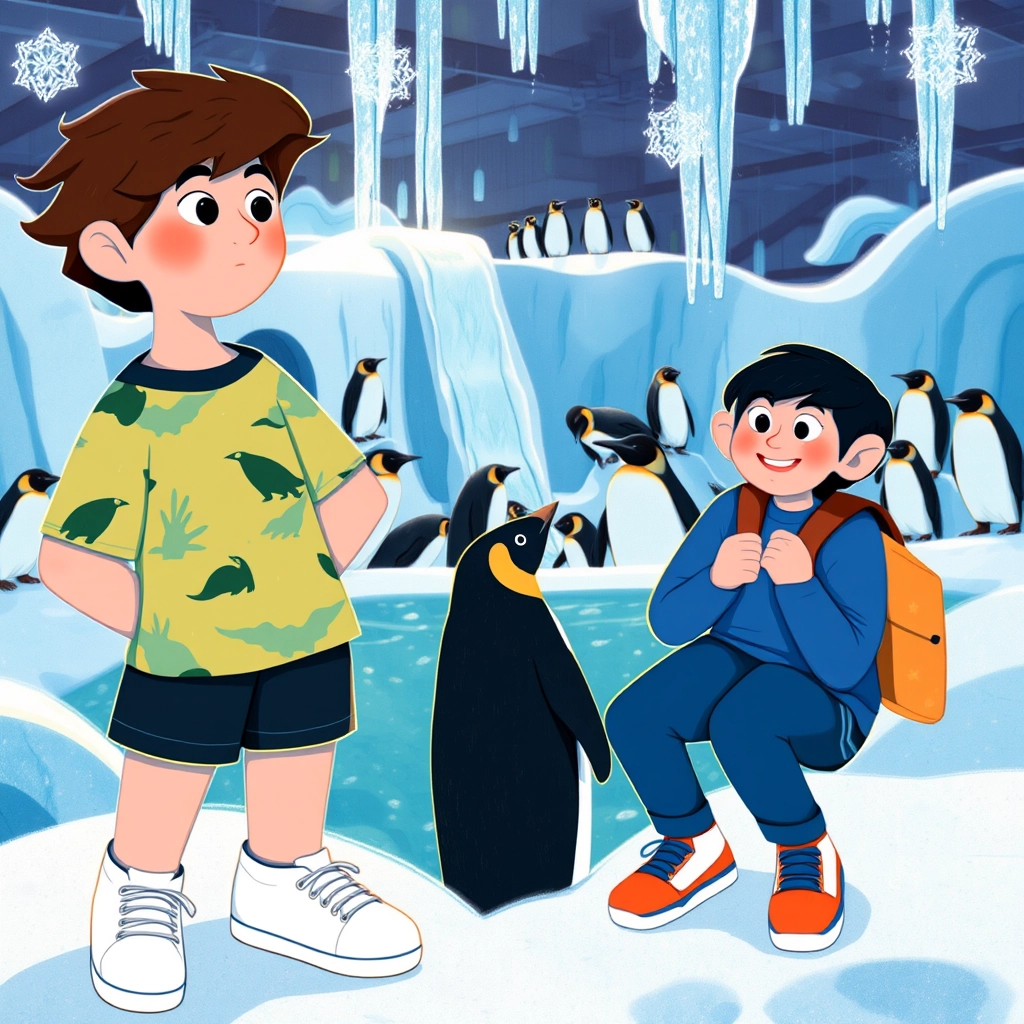 Next, they wandered into the Penguin Pavilion. It was chilly inside, and the floor was covered in sparkling ice. Penguin families waddled and slid down icy ramps, making [Ben](TW5Z2WK4) and [Emory](BQTW9327) laugh.