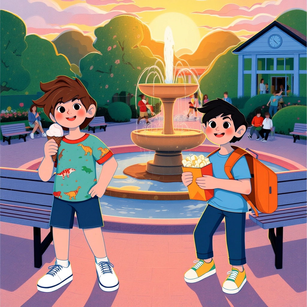 As the sun began to set, [Ben](TW5Z2WK4) and [Emory](BQTW9327) sat by the zoo fountain, munching on snacks. 'This was the best day ever!' said [Ben](TW5Z2WK4). [Emory](BQTW9327) nodded with a big smile, 'Let's come back soon!'