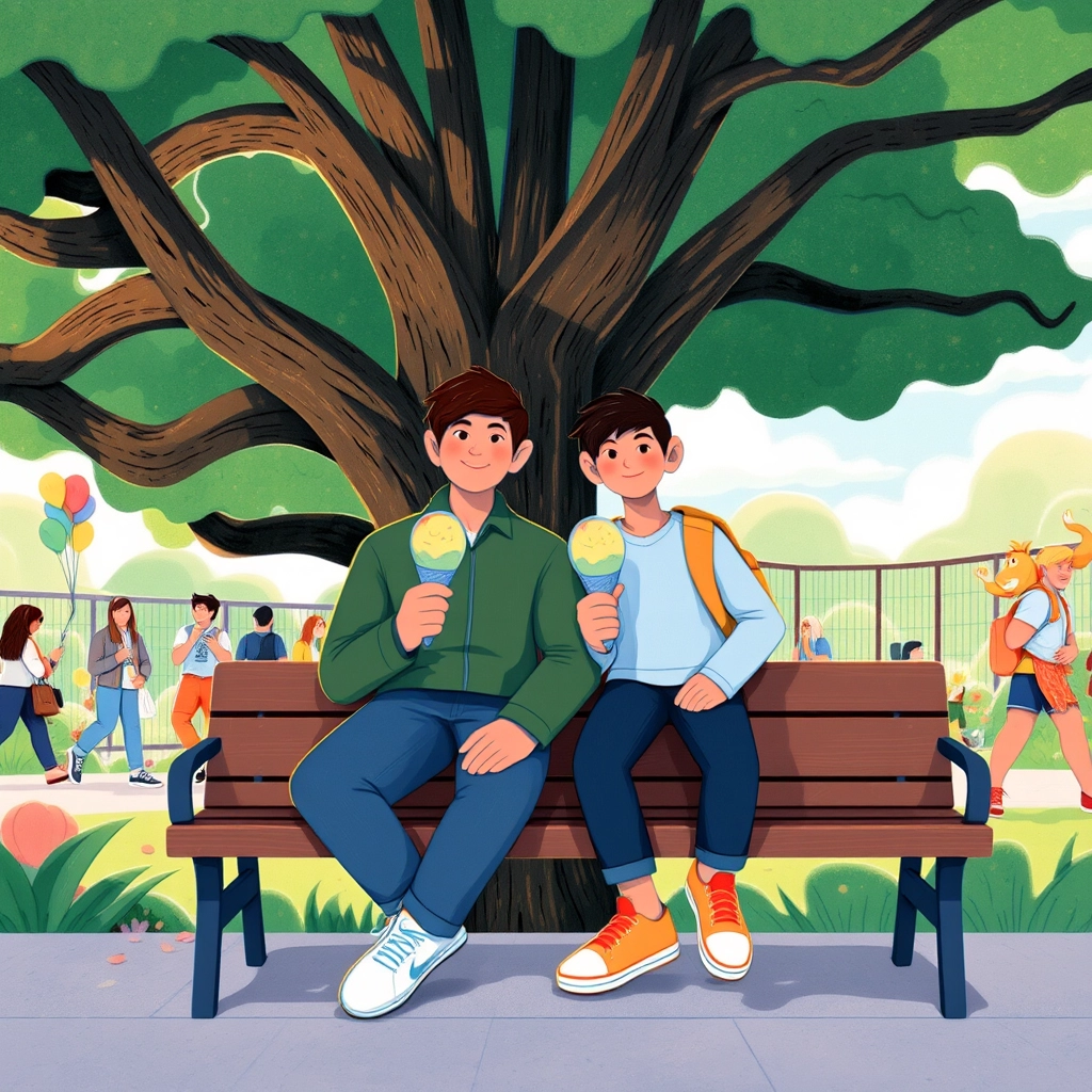 After a day filled with exciting animals and adventures, [Ben](TW5Z2WK4) and [Emory](BQTW9327) sat on a bench enjoying ice creams, laughing about all the memories they made together.