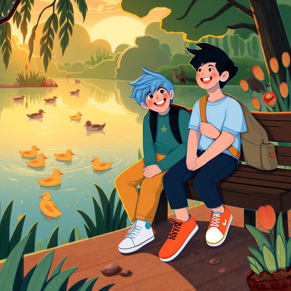 As the sun began to set, [Ben](TW5Z2WK4) and [Emory](BQTW9327) sat on a bench overlooking a pond with ducks gliding over the water. 'This was the best day ever!' said [Emory](BQTW9327) with a big smile. [Ben](TW5Z2WK4) nodded in agreement.