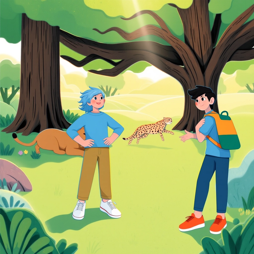 At the Big Cat Enclosure, they saw majestic lions lounging under a tree and a graceful cheetah running across the grass. 'I wish I could run like that!' said [Emory](BQTW9327), laughing.