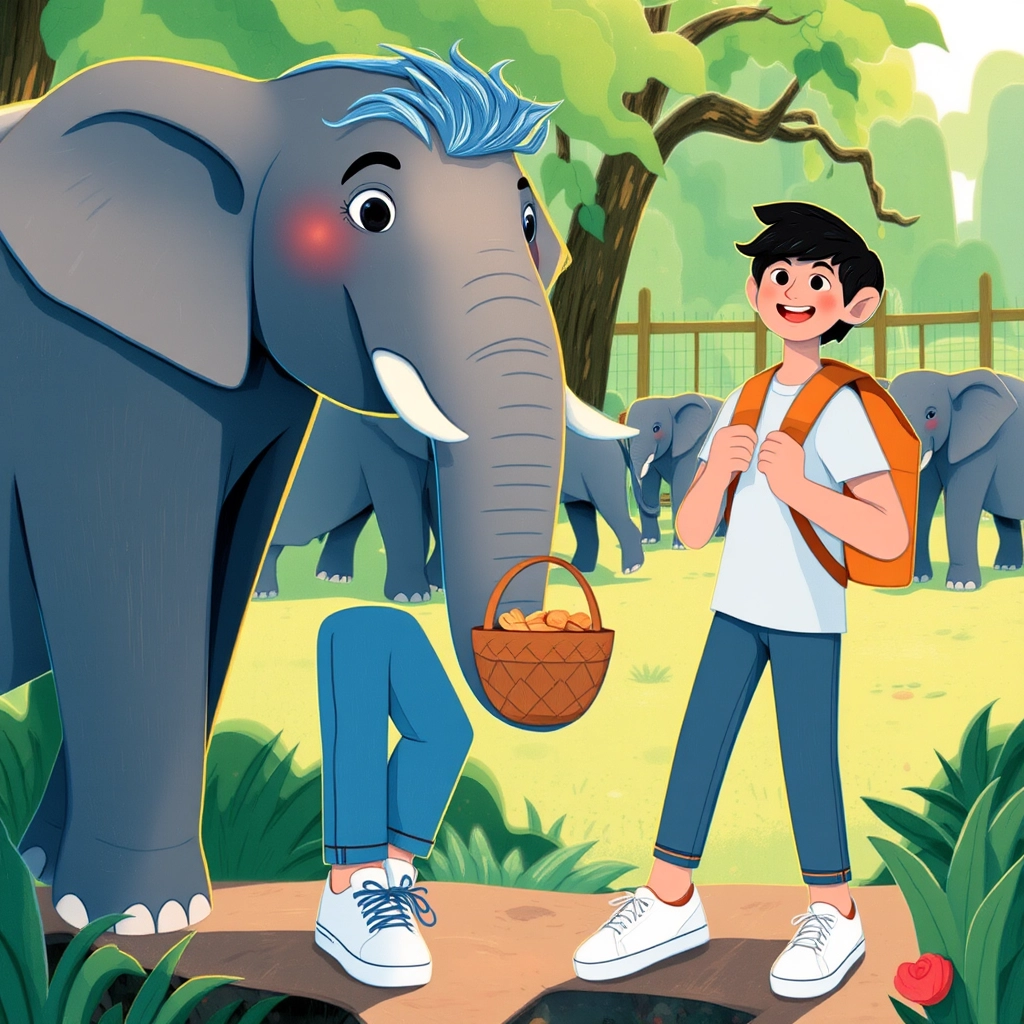 Later, they fed the elephants! [Ben](TW5Z2WK4) handed [Emory](BQTW9327) a small basket of peanuts, and [Emory](BQTW9327) giggled nervously when a gentle elephant trunk grabbed the treat.