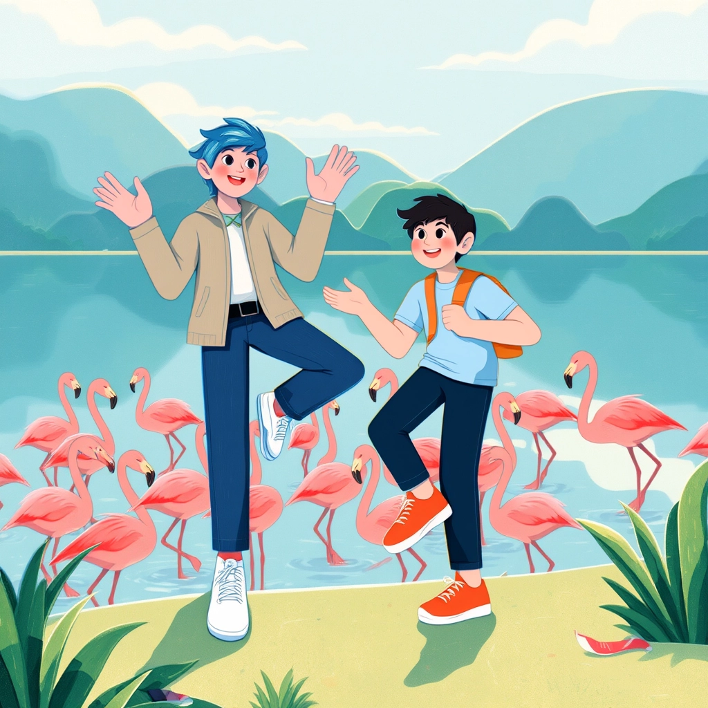 They took a break at Flamingo Lake, where pink flamingos stood gracefully on one leg. [Ben](TW5Z2WK4) tried balancing on one leg, and [Emory](BQTW9327) joined in, trying not to topple over into the grass!