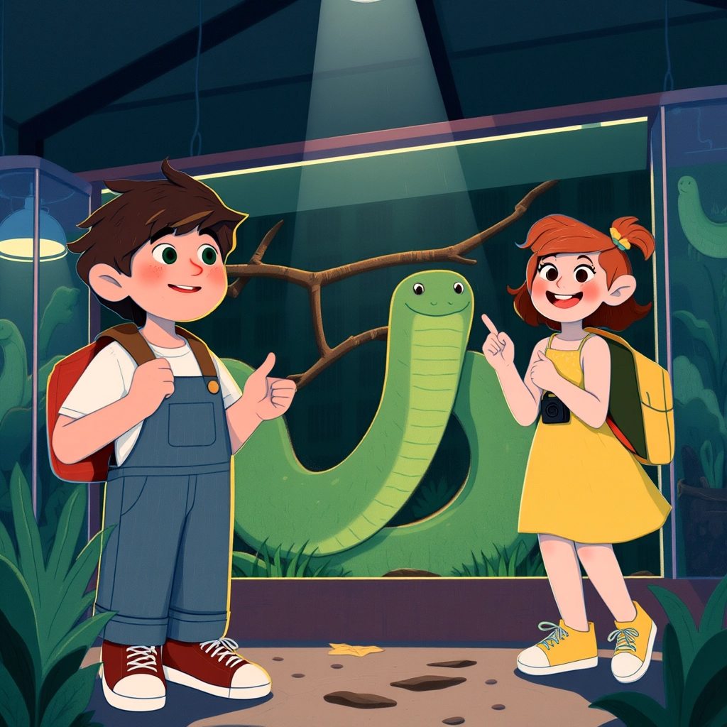 When they visited the reptile house, [Ben](XBH9KXY4) stared wide-eyed at a gigantic green anaconda resting behind its glass. [Emory](L99QSGX9) pretended to hiss like a snake, making [Ben](XBH9KXY4) giggle nervously.