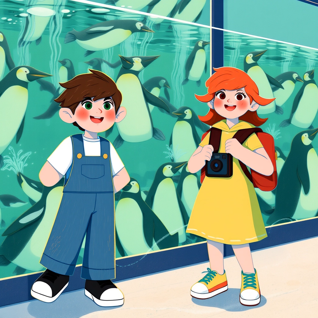 Next, they found the penguins sliding into the sparkling blue water. [Emory](L99QSGX9) pressed her face against the glass, waving at the playful penguins, while [Ben](XBH9KXY4) tried waddling like one, much to her amusement.