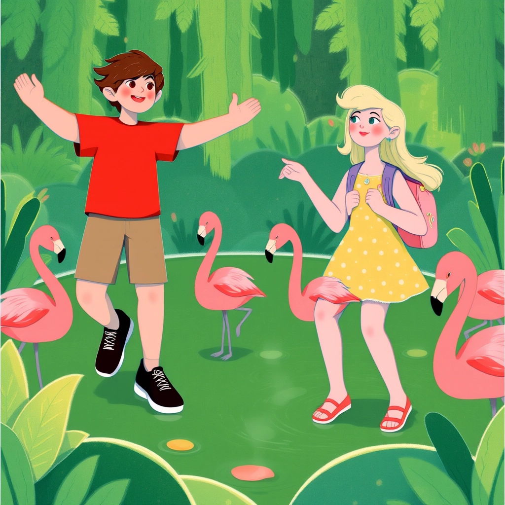 Next, they visited the flamingos, gracefully standing on one leg. [Greta](9TGJ4HMP) stood balanced, mimicking them, while [Ben](TW5Z2WK4) made silly flapping motions.