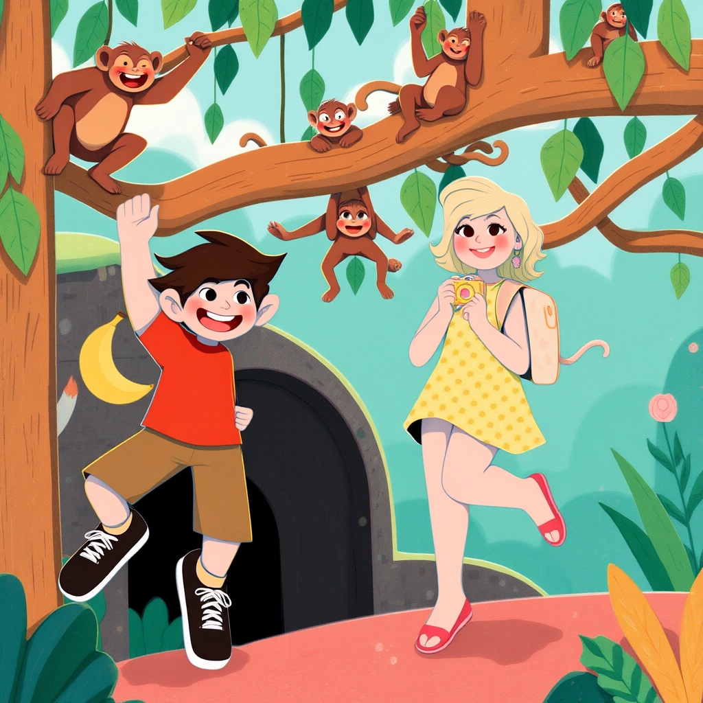 At the monkey habitat, the playful monkeys swung from vines. [Ben](TW5Z2WK4) climbed a pretend vine on the playground nearby, and [Greta](9TGJ4HMP) snapped photos.