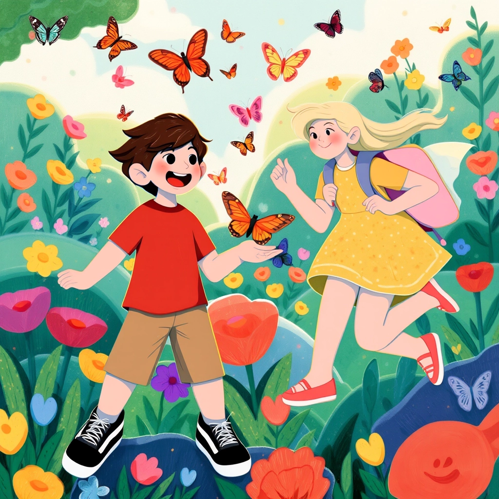 Finally, they visited the butterfly garden. Brightly colored butterflies fluttered around as [Greta](9TGJ4HMP) held out her hand and a butterfly landed on her finger. [Ben](TW5Z2WK4) chased after them, laughing.
