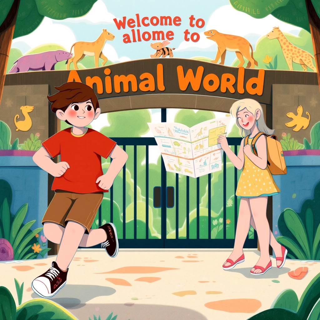 When they arrived at the zoo, a big sign read 'Welcome to Animal World!' [Ben](TW5Z2WK4) dashed forward while [Greta](9TGJ4HMP) unfolded the zoo map to plan their adventure.
