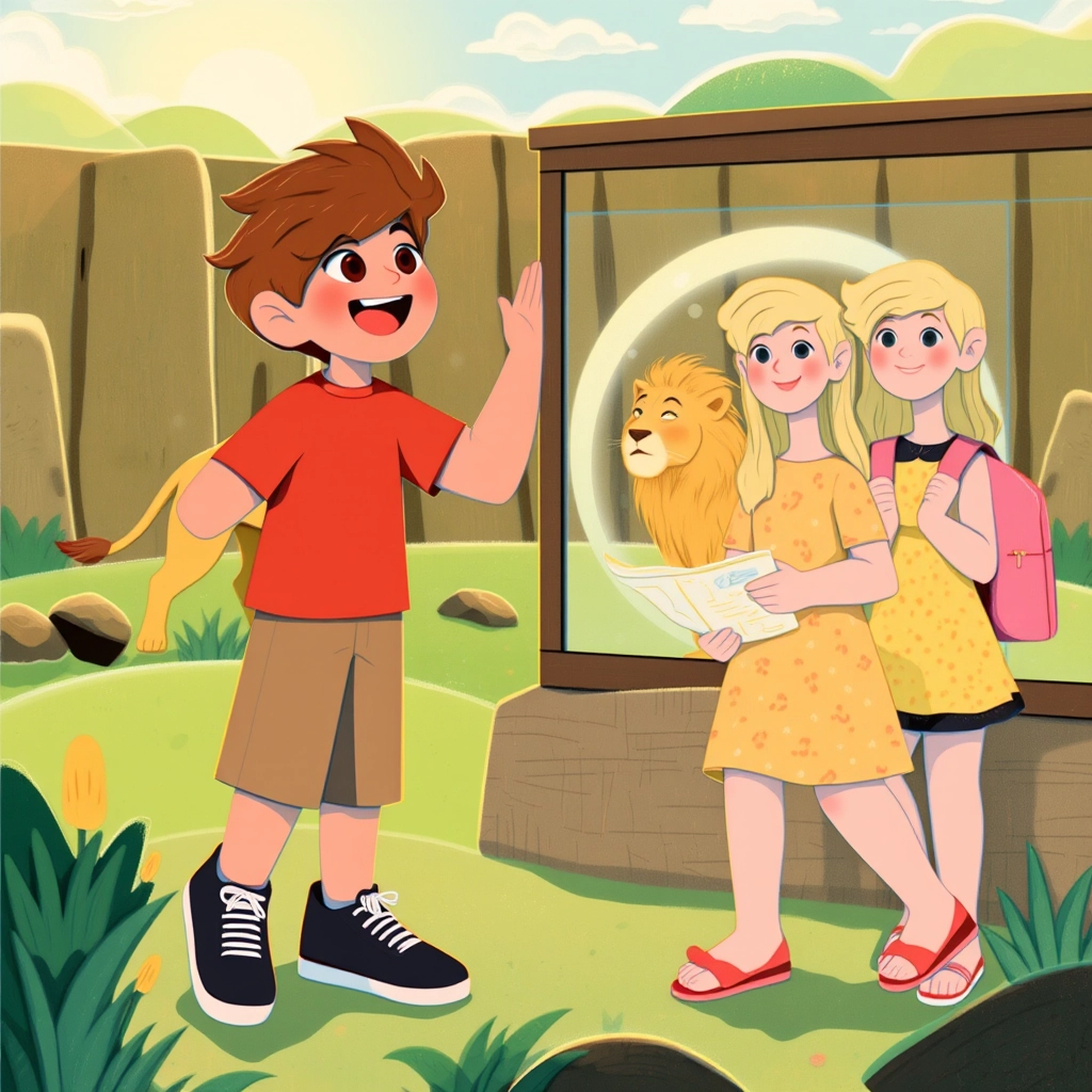 First stop was the lion enclosure. The lions basked in the sun, their golden manes shimmering as [Ben](TW5Z2WK4) roared playfully, and [Greta](9TGJ4HMP) giggled.