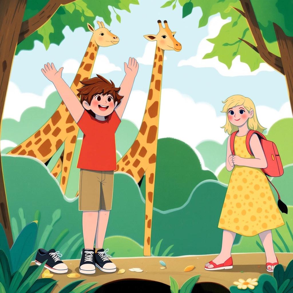 The giraffes towered high above, eating leaves from tall trees. [Greta](9TGJ4HMP) admired their long necks as [Ben](TW5Z2WK4) tried to stretch up to reach the sky.