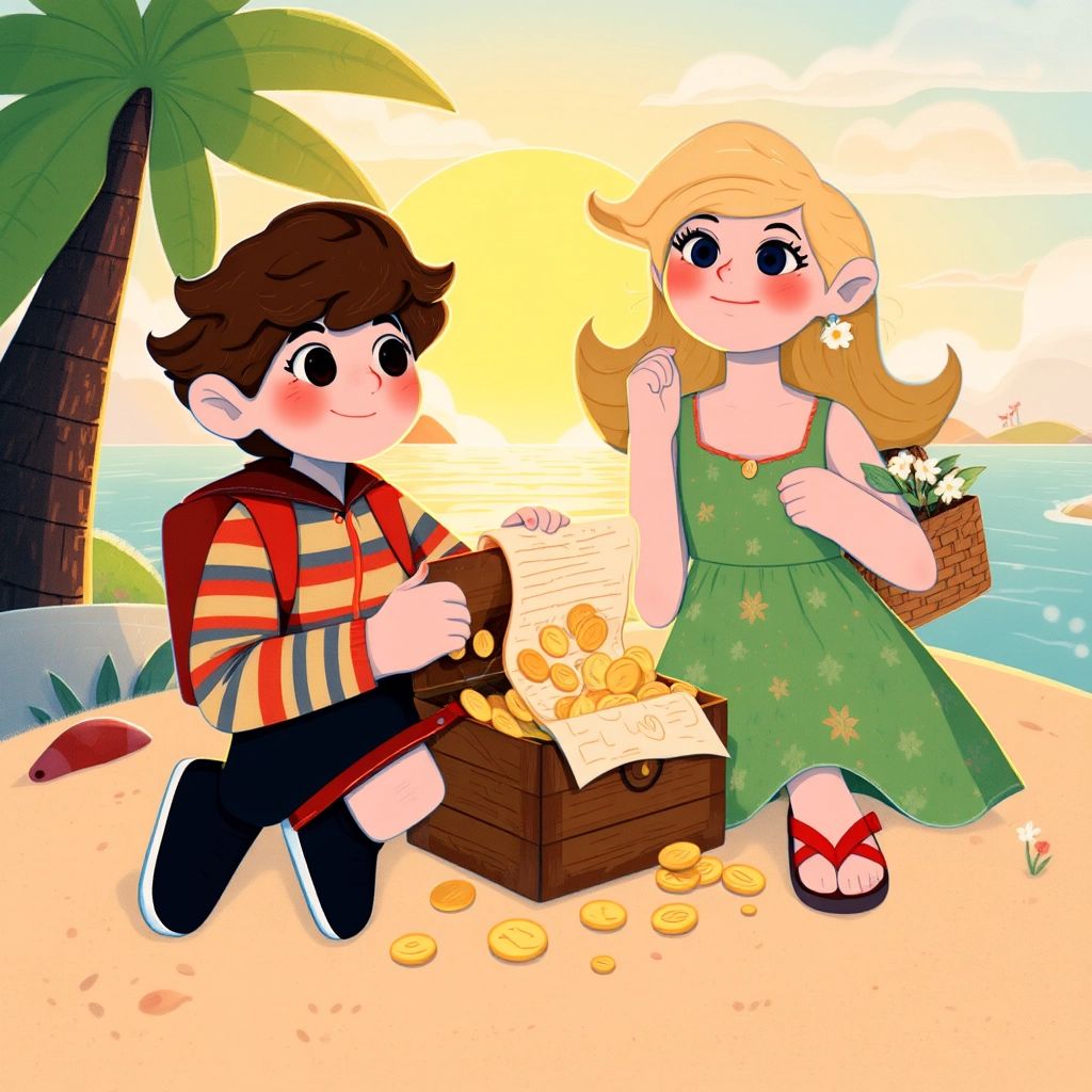 [Ben](B94SZWPG) and [Greta](SR5JT6C4) dug the chest out of the sand and unlocked it with the key. Inside, they found old coins, a map of Virginia Lake, and a note that read, "For curious explorers like you!" [Greta](SR5JT6C4) laughed, saying, "This treasure is perfect for us!"
