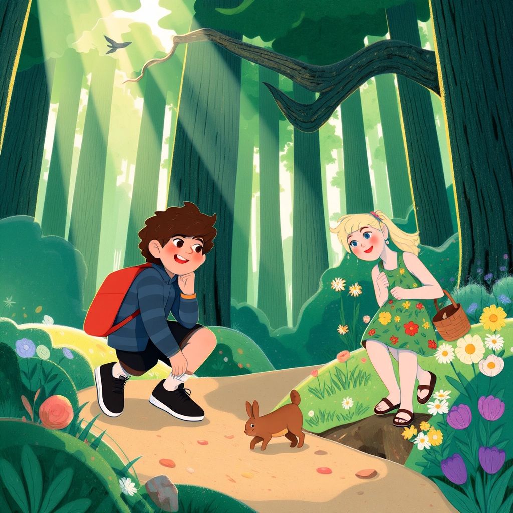 As they walked through the forest trail, the tall trees whispered in the breeze. [Ben](B94SZWPG) pointed to a rabbit hopping across the path, while [Greta](SR5JT6C4) stopped to pick a daisy. "I can’t wait to see the lake!" [Ben](B94SZWPG) said, his eyes sparkling with curiosity.