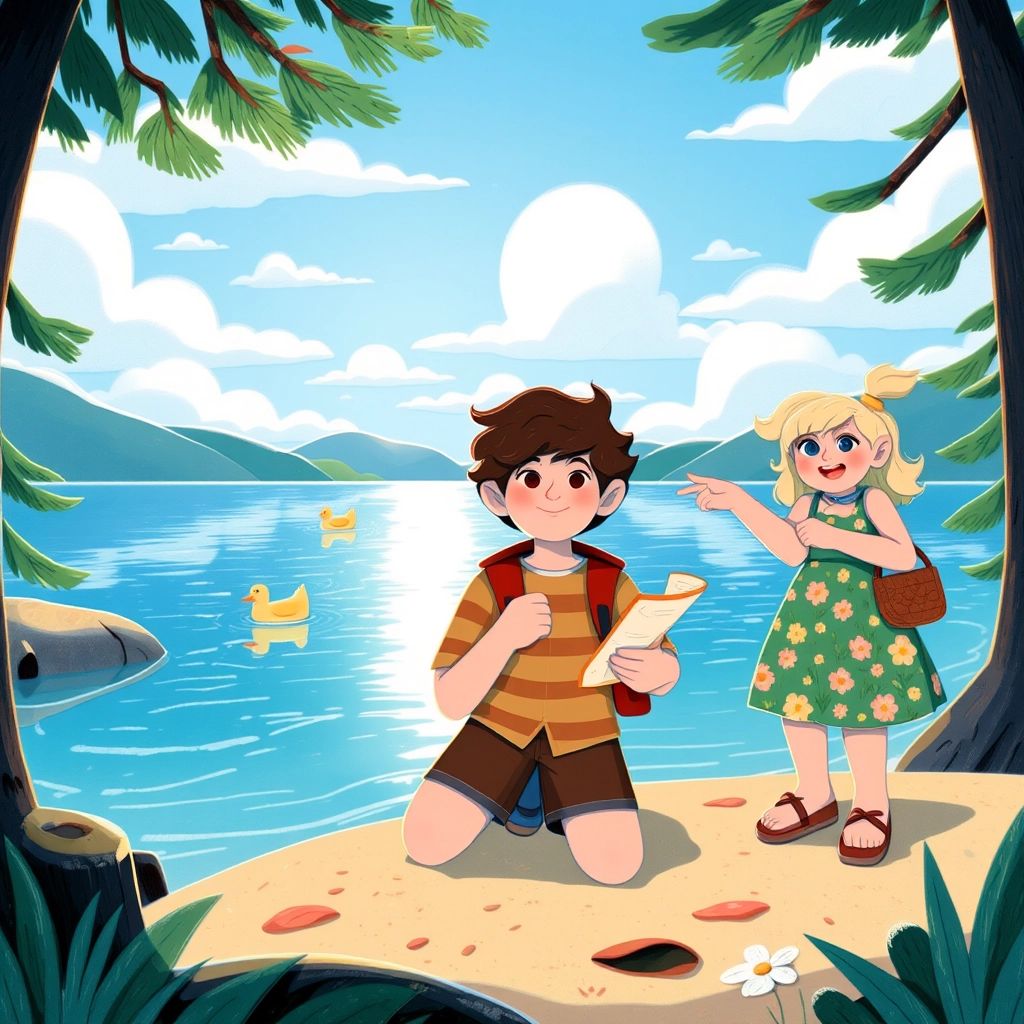 At last, they reached Virginia Lake, and it was more beautiful than they ever imagined. The water sparkled like diamonds under the sun, and [Greta](SR5JT6C4) spotted two ducks paddling near the shore. [Ben](B94SZWPG) unfolded his treasure map and began to study it intently.