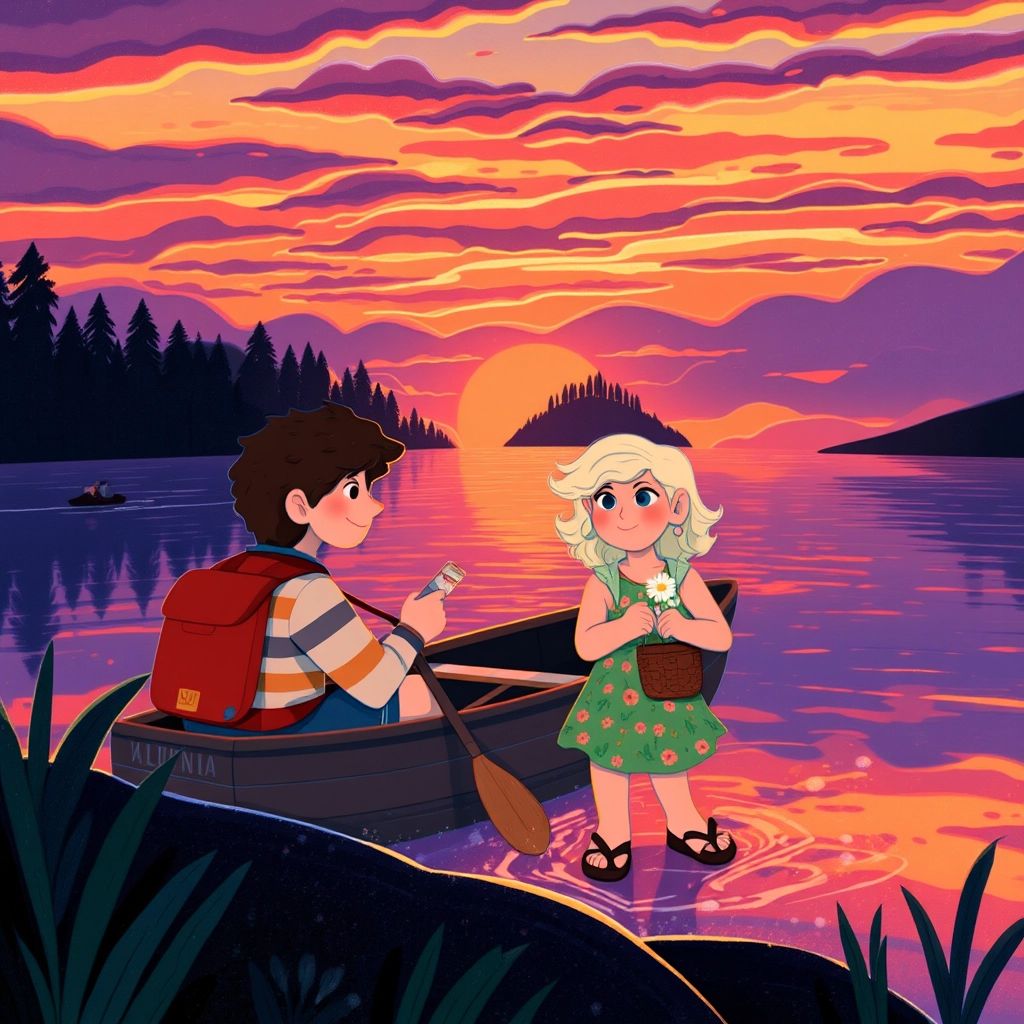 As the sun set, they rowed back to the shore. The sky was painted with oranges, pinks, and purples. "Goodbye, Virginia Lake!" [Greta](SR5JT6C4) called out. "Until next time!" added [Ben](B94SZWPG). Their hearts were full of joy, and they couldn’t wait for more adventures.