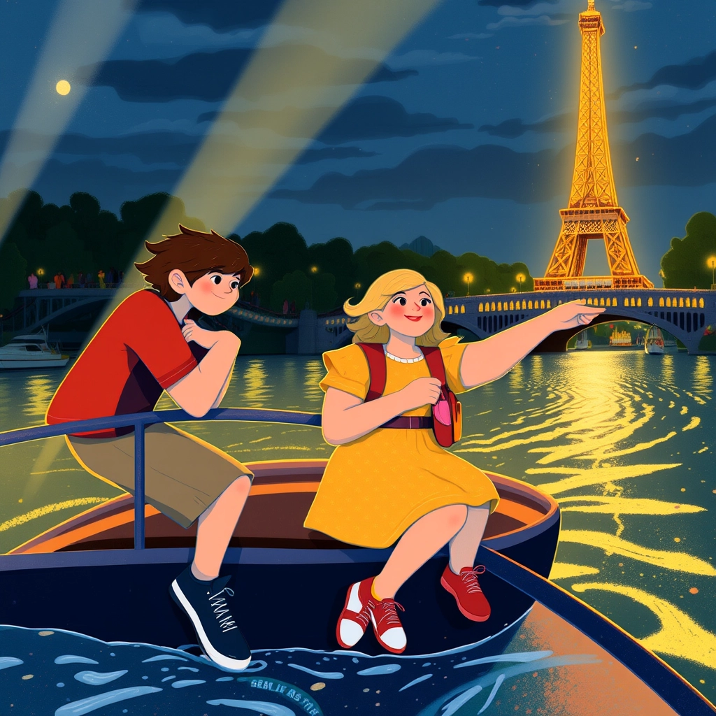 In the evening, they joined a boat ride on the Seine. The whole city glowed with twinkling lights, and the bridges looked magical. [Greta](9TGJ4HMP) pointed to the lit-up Eiffel Tower. 'It's like a sparkling star!' she said.
