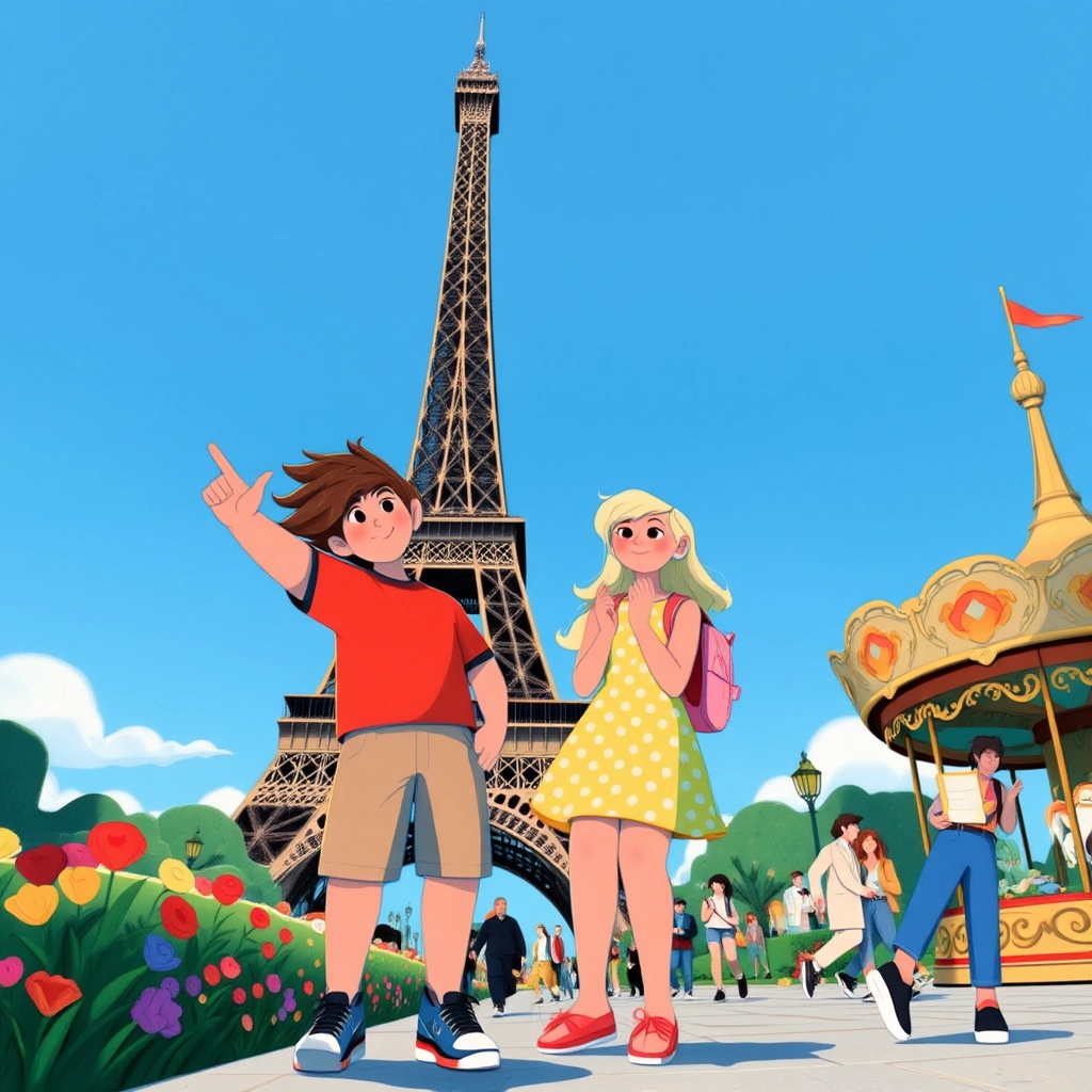It was their first day in Paris, and [Ben](TW5Z2WK4) and [Greta](9TGJ4HMP) couldn't believe their eyes. The Eiffel Tower stood tall and sparkling in the sunlight. 'Let's climb it!' [Ben](TW5Z2WK4) exclaimed as [Greta](9TGJ4HMP) cheered with excitement.