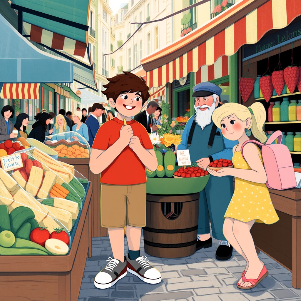 The next day, [Ben](TW5Z2WK4) and [Greta](9TGJ4HMP) visited a bustling market. They saw colorful fruits, fresh baguettes, and festive bouquets. A kind vendor gave them samples of French cheese, which they both loved.