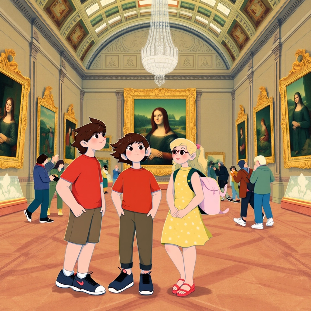 The next stop was the Louvre Museum. In the grand hall, [Greta](9TGJ4HMP)'s eyes sparkled as they saw the Mona Lisa. 'She's smiling, but why?' asked [Ben](TW5Z2WK4). 'Maybe she's keeping a fun secret,' guessed [Greta](9TGJ4HMP).