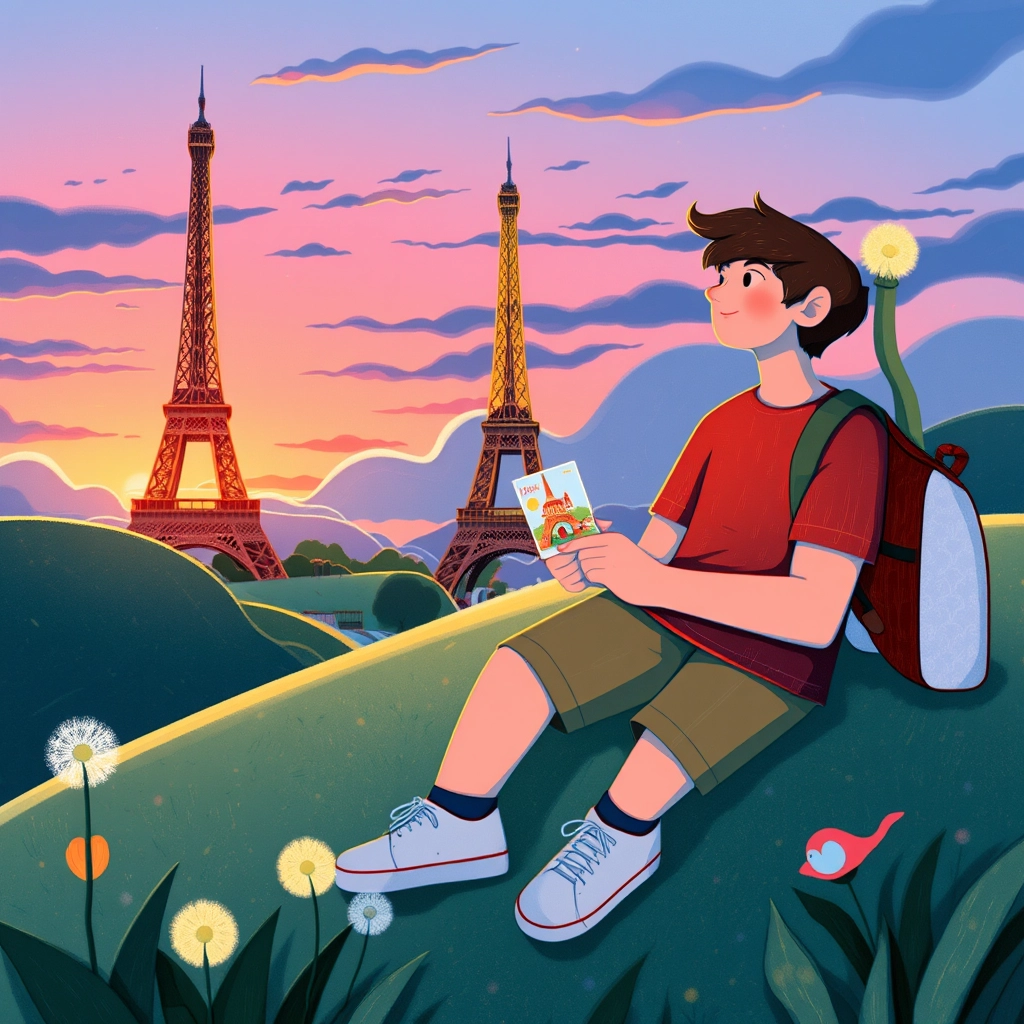 As their trip ended, [Ben](TW5Z2WK4) and [Greta](9TGJ4HMP) watched the Eiffel Tower one last time. 'We'll always have Paris,' said [Greta](9TGJ4HMP), holding her new postcard. [Ben](TW5Z2WK4) nodded. 'And so many memories!'