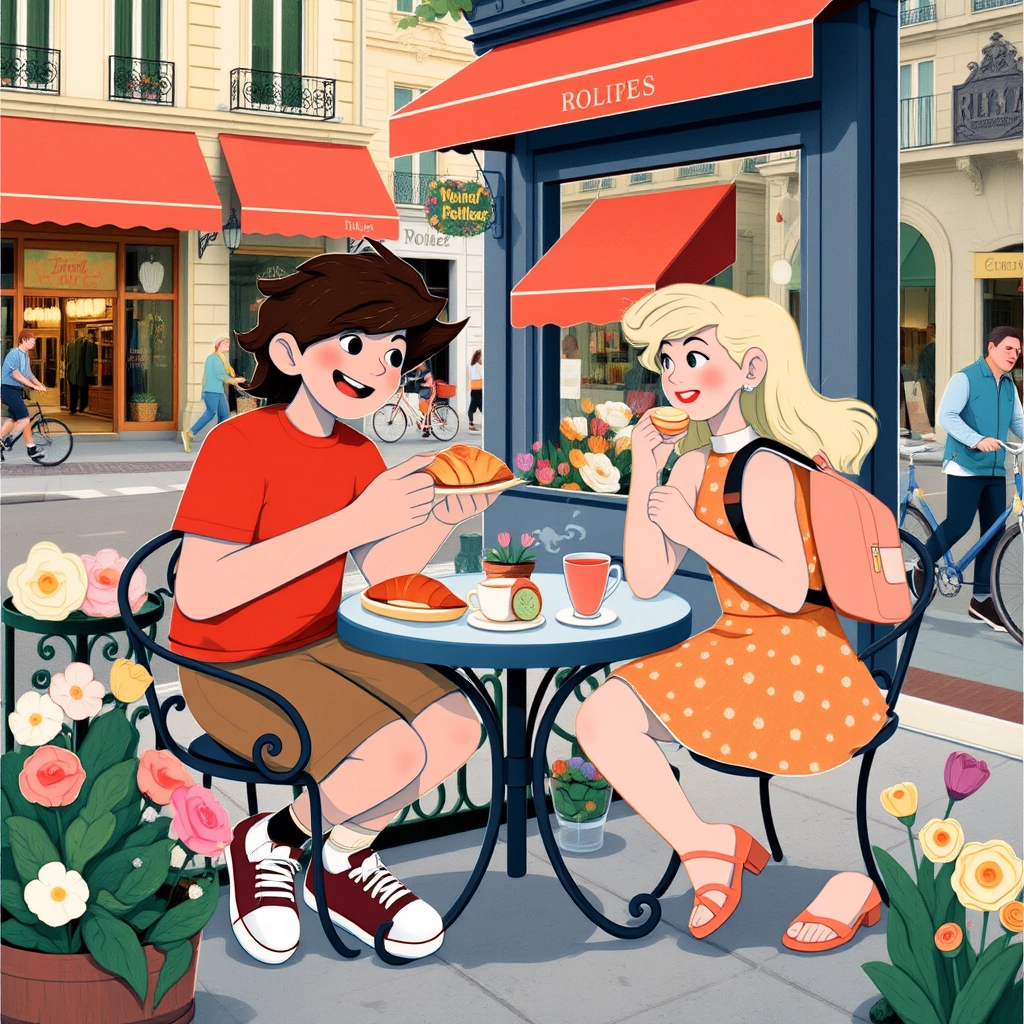 Hungry after their museum visit, the duo stopped by a cozy café. They laughed as they shared buttery croissants and tried macarons in all colors of the rainbow. 'Delicious!' they both agreed, giggling.