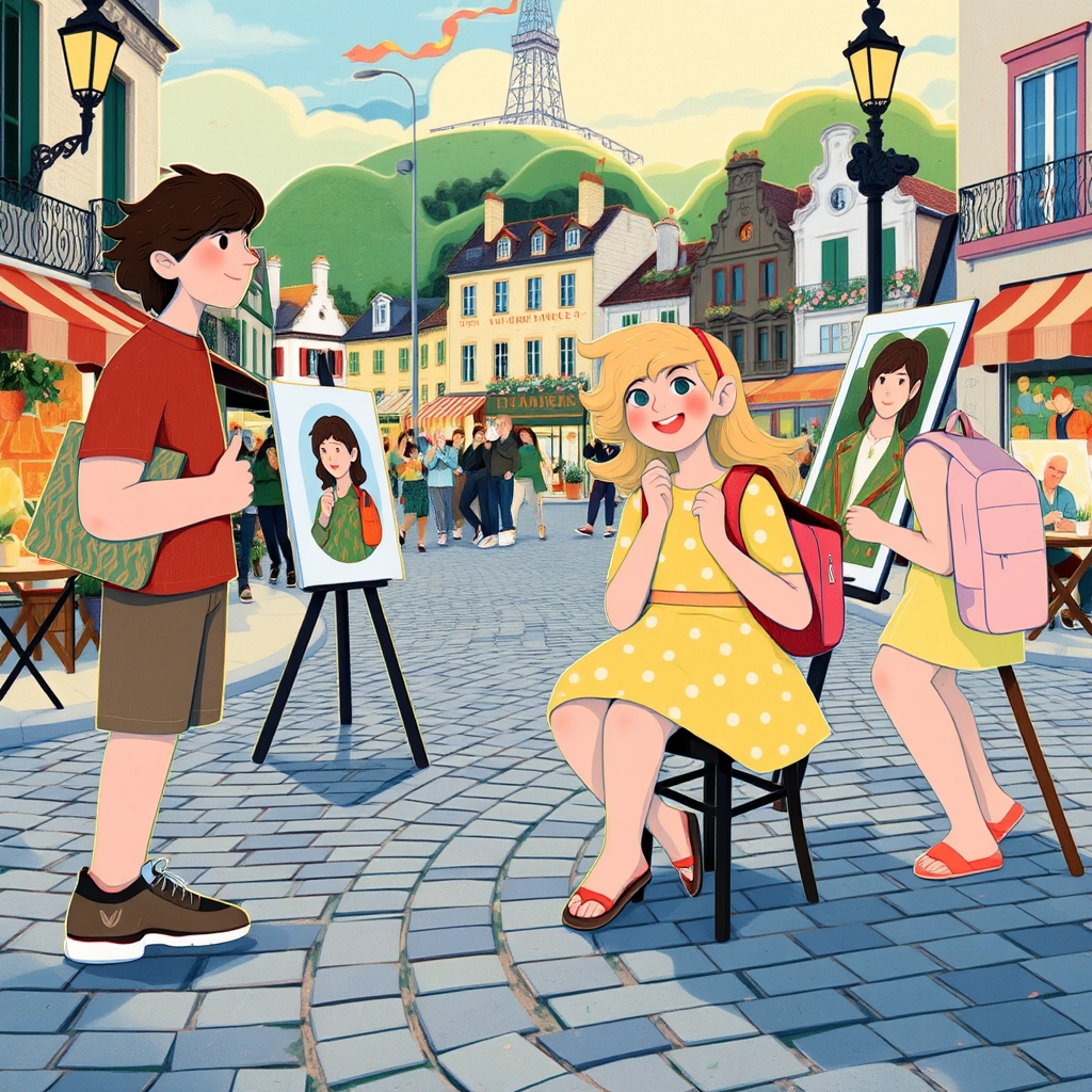 Before heading home, they discovered Montmartre. Artists painted portraits in the square, and [Greta](9TGJ4HMP) posed for one. [Ben](TW5Z2WK4) laughed, 'You look just like the paintings in the Louvre now!'