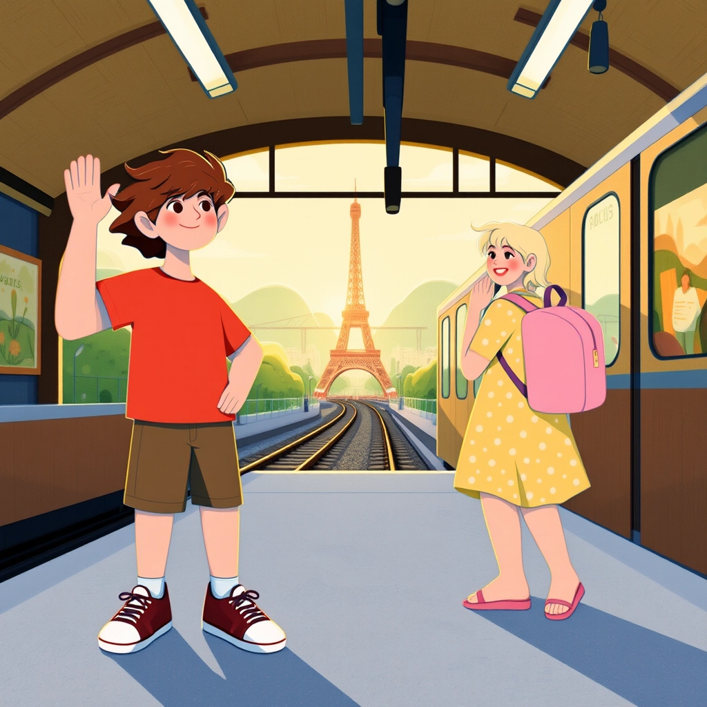 [Ben](TW5Z2WK4) and [Greta](9TGJ4HMP) waved goodbye to Paris, their hearts full of wonder. 'What a magical city,' [Ben](TW5Z2WK4) said. [Greta](9TGJ4HMP) smiled. 'Let's visit new places next!' And with that, their adventure continued.