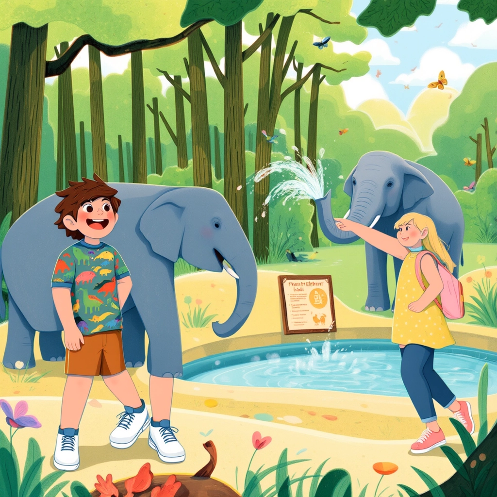 The big, gray elephants greeted them with their trumpet-like sounds. 'Did you know elephants have their own special way of talking to each other using their trunks?' said [Greta](9TGJ4HMP), reading from a sign. [Ben](TW5Z2WK4) laughed as an elephant playfully sprayed water.
